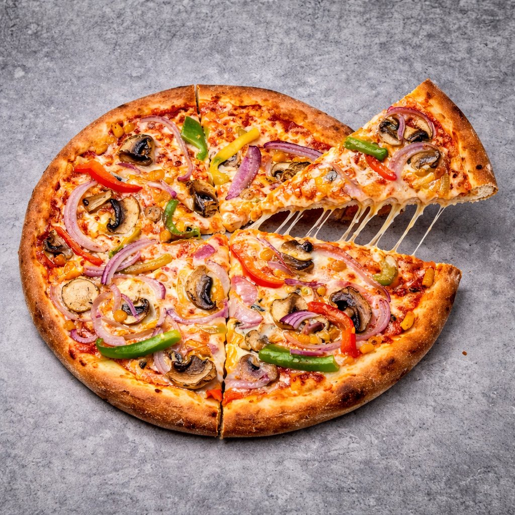 Onions, Mushrooms, Green Peppers, Sweetcorn topped with Mozzarella Style Vegan Cheese